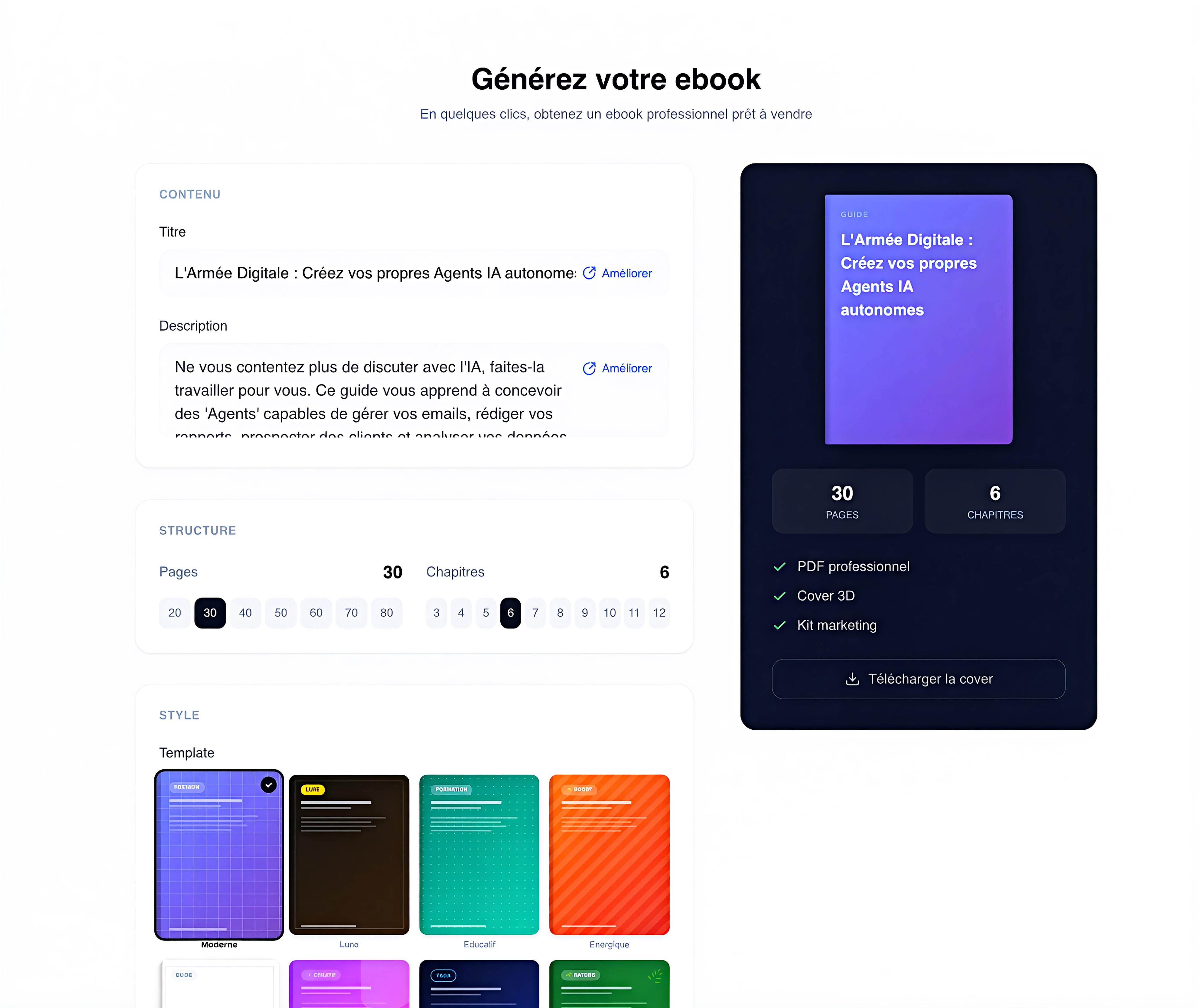 Décris ton sujet, choisis ton template, ton ton et ton audience. L'IA rédige un ebook complet avec sommaire, chapitres et cover 3D ,prêt à vendre en moins d'une minute.