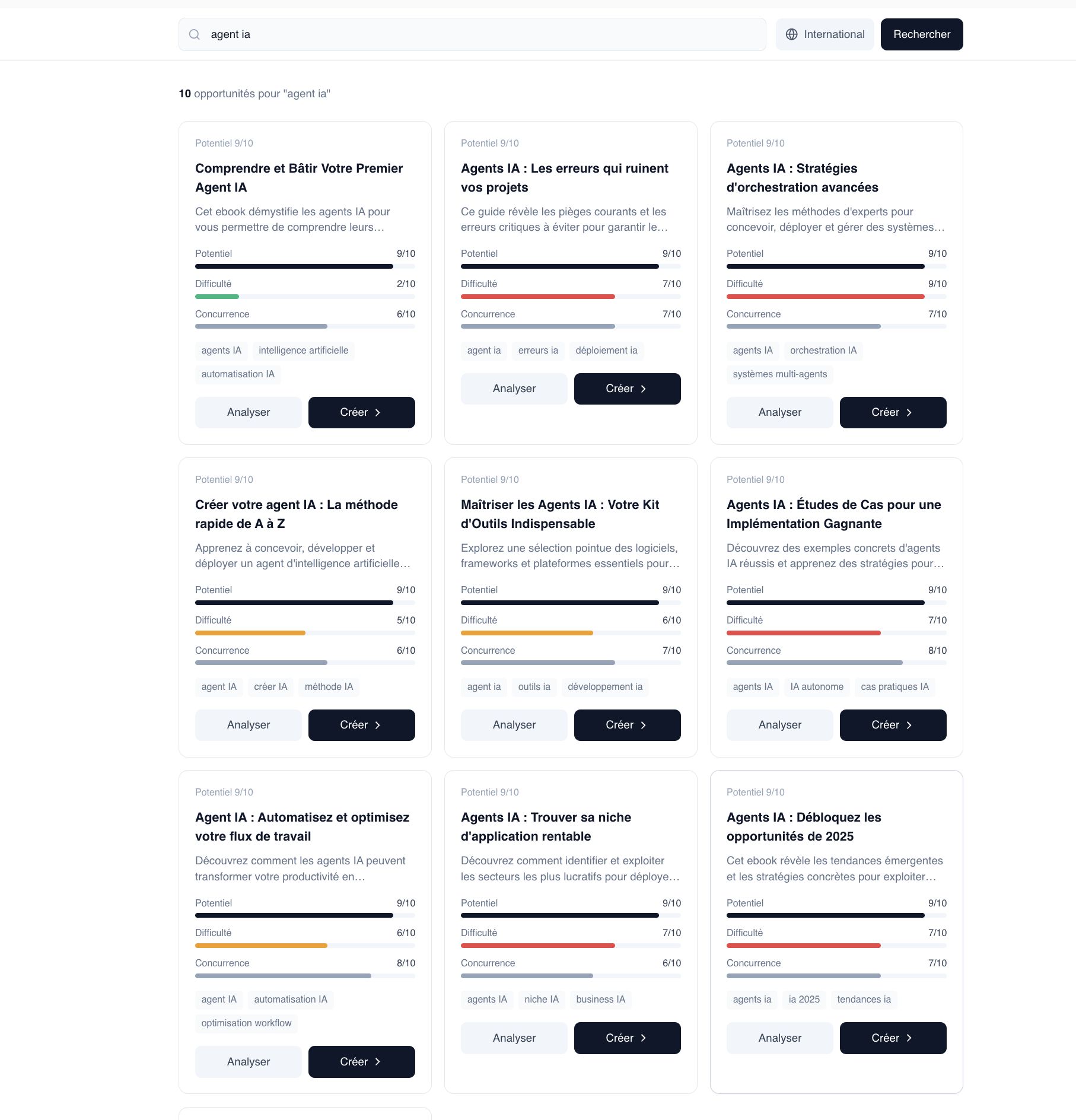 Entre un thème, choisis ton marché (Afrique ou International). L'IA analyse le potentiel, la difficulté et la concurrence pour chaque niche et tu crées ton ebook en 1 clic.