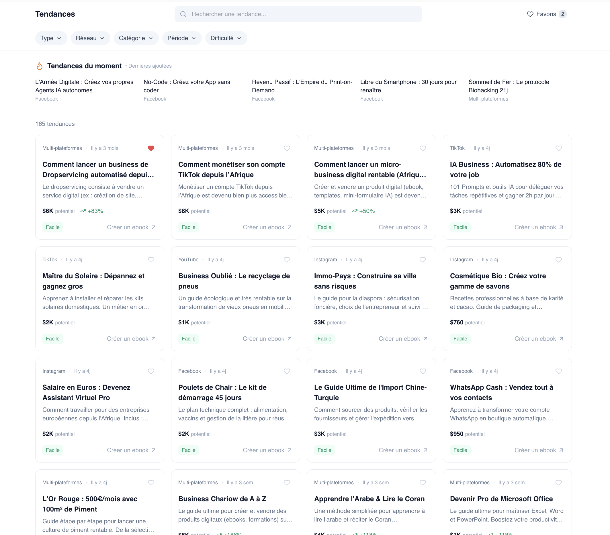 Découvre en temps réel ce qui buzz sur TikTok, Instagram, YouTube et Facebook. Filtre par catégorie, réseau ou difficulté et lance la création de ton ebook directement depuis la tendance.