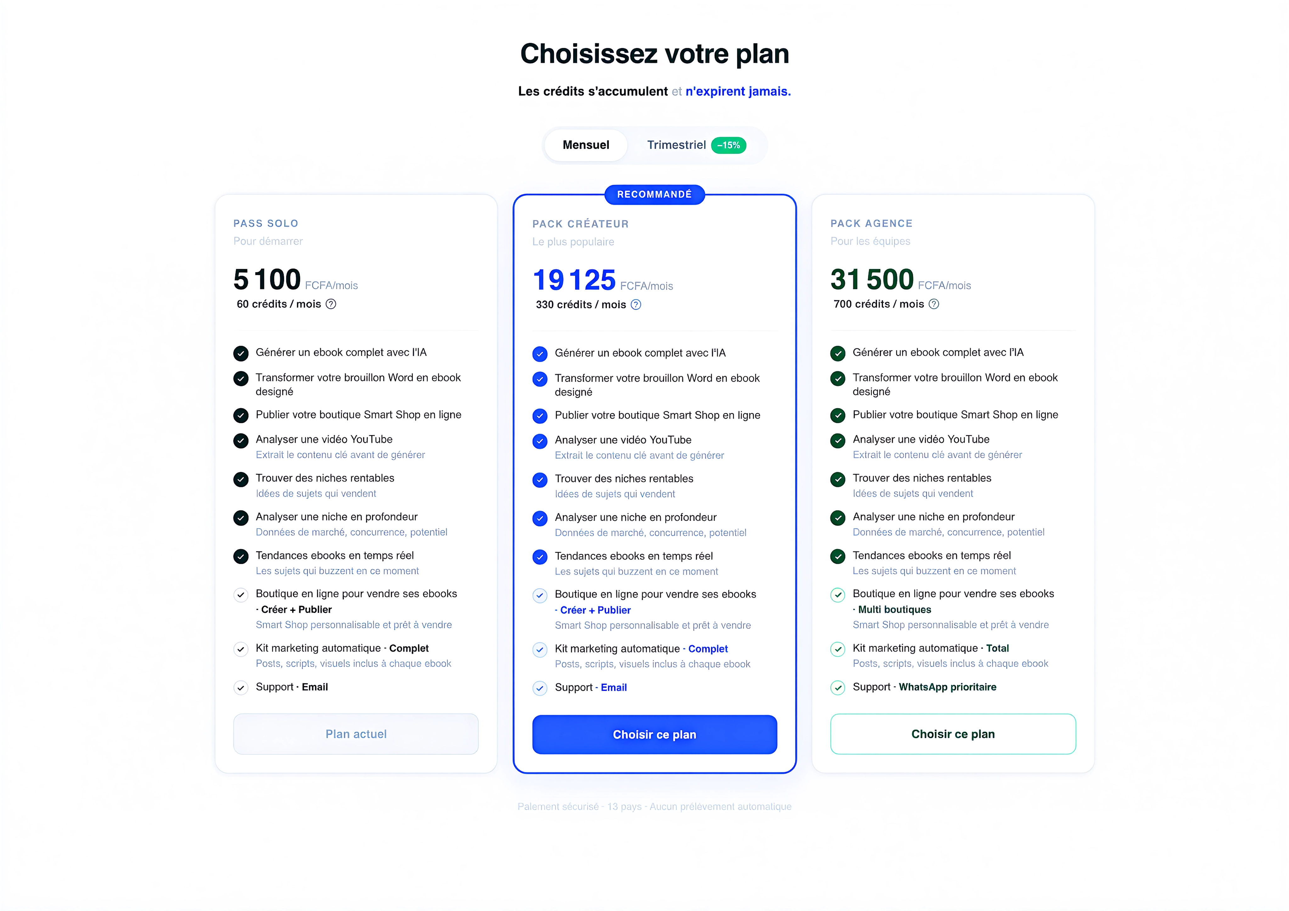 Le nouveau système de crédits vous donne le contrôle total. Choisissez votre plan, accumulez vos crédits — ils n'expirent jamais. Générez un ebook (20 cr.), faites une mise en page Express (10 cr.), créez votre Smart Shop (5 cr.). Plus vous prenez un gros plan, moins vous payez par action. Simple, transparent, rentable.