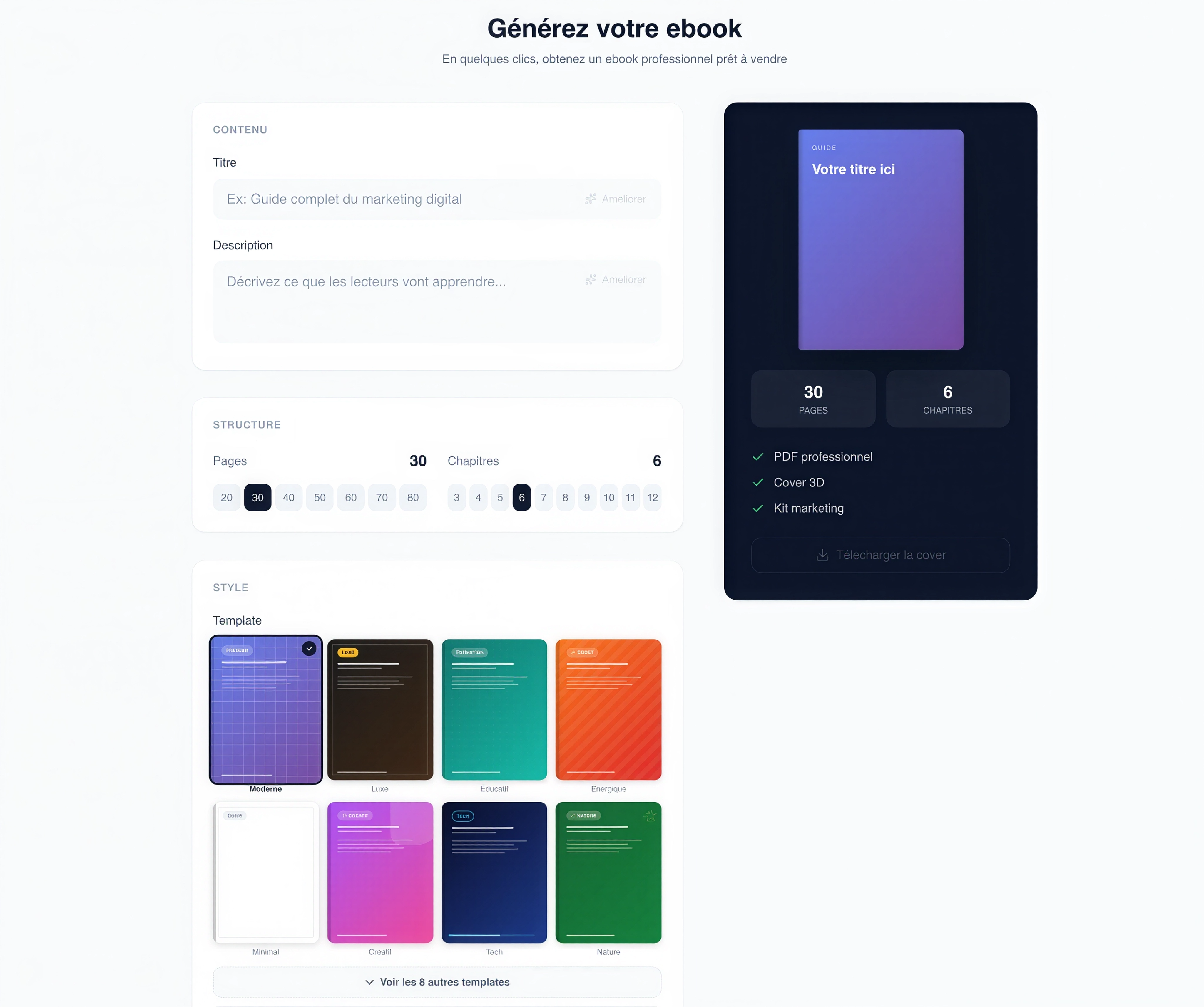 On est passé de 6 à 12 templates entièrement repensés. Chaque template a été designé pour convertir : typographies premium, mises en page aérées, hiérarchie visuelle soignée. Vos ebooks ne ressemblent plus à des documents Word. Ils ressemblent à des produits que les gens veulent acheter.