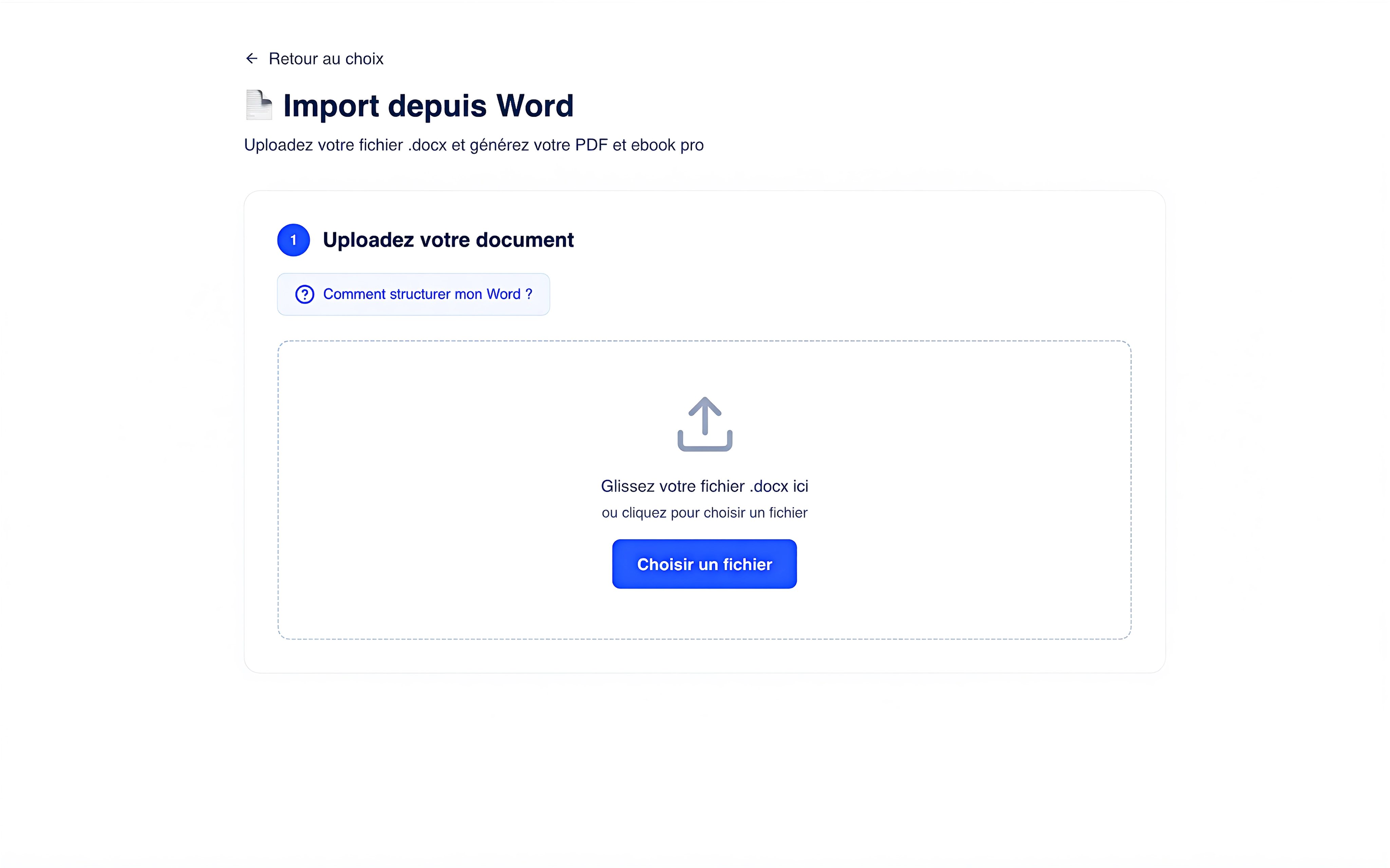 Vous avez déjà votre contenu ? Pas besoin de tout réécrire. Importez votre fichier Word (.docx) ou collez votre texte directement. Bookzy Express applique un design professionnel en moins de 20 secondes. Votre contenu brut devient un ebook prêt à vendre, sans effort, sans compromis.